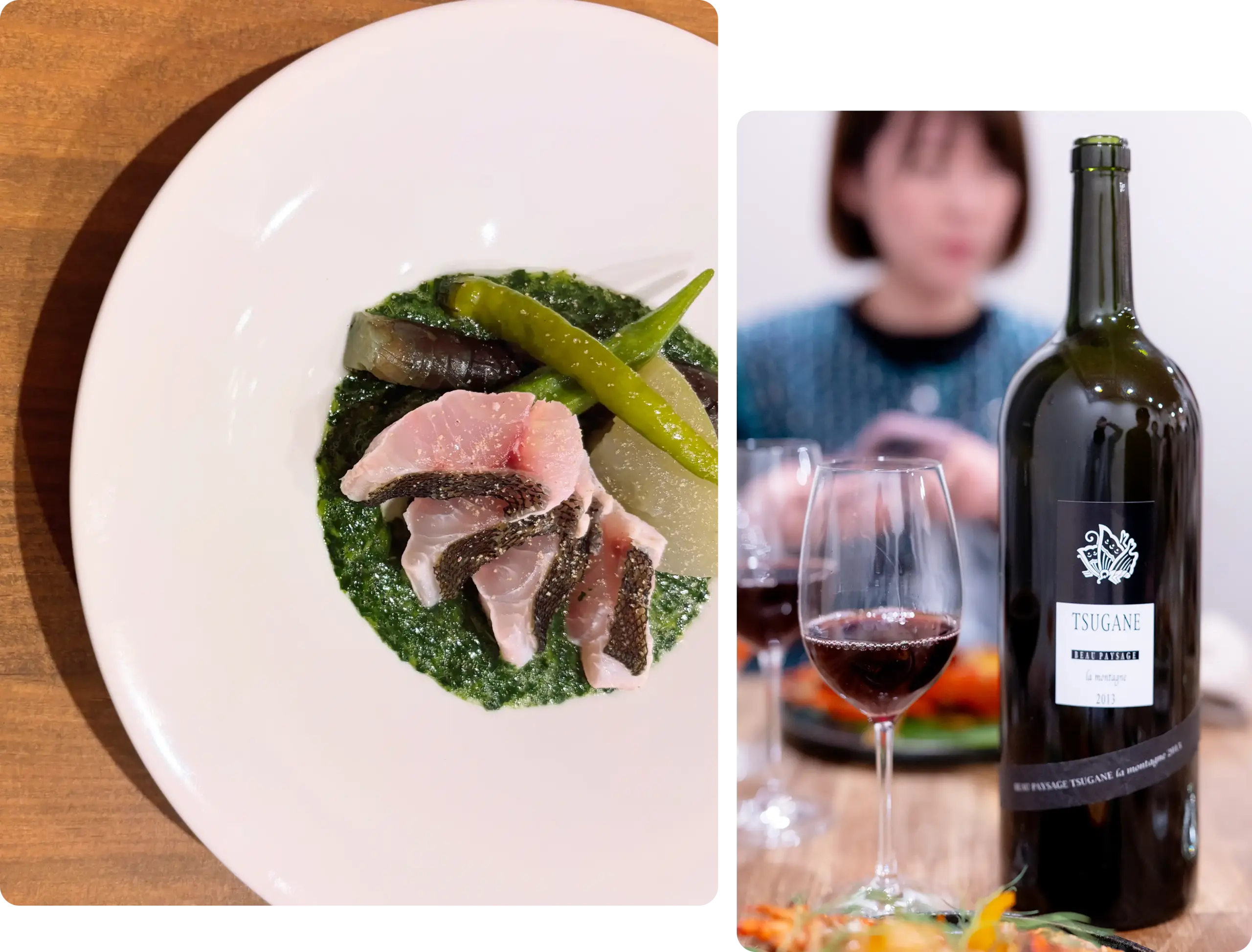常時300本以上を揃える世界中のナチュラルワインは、料理に合わせたペアリングもご提案。一期一会の組み合わせで、ここでしか味わえないひとときをお楽しみください。